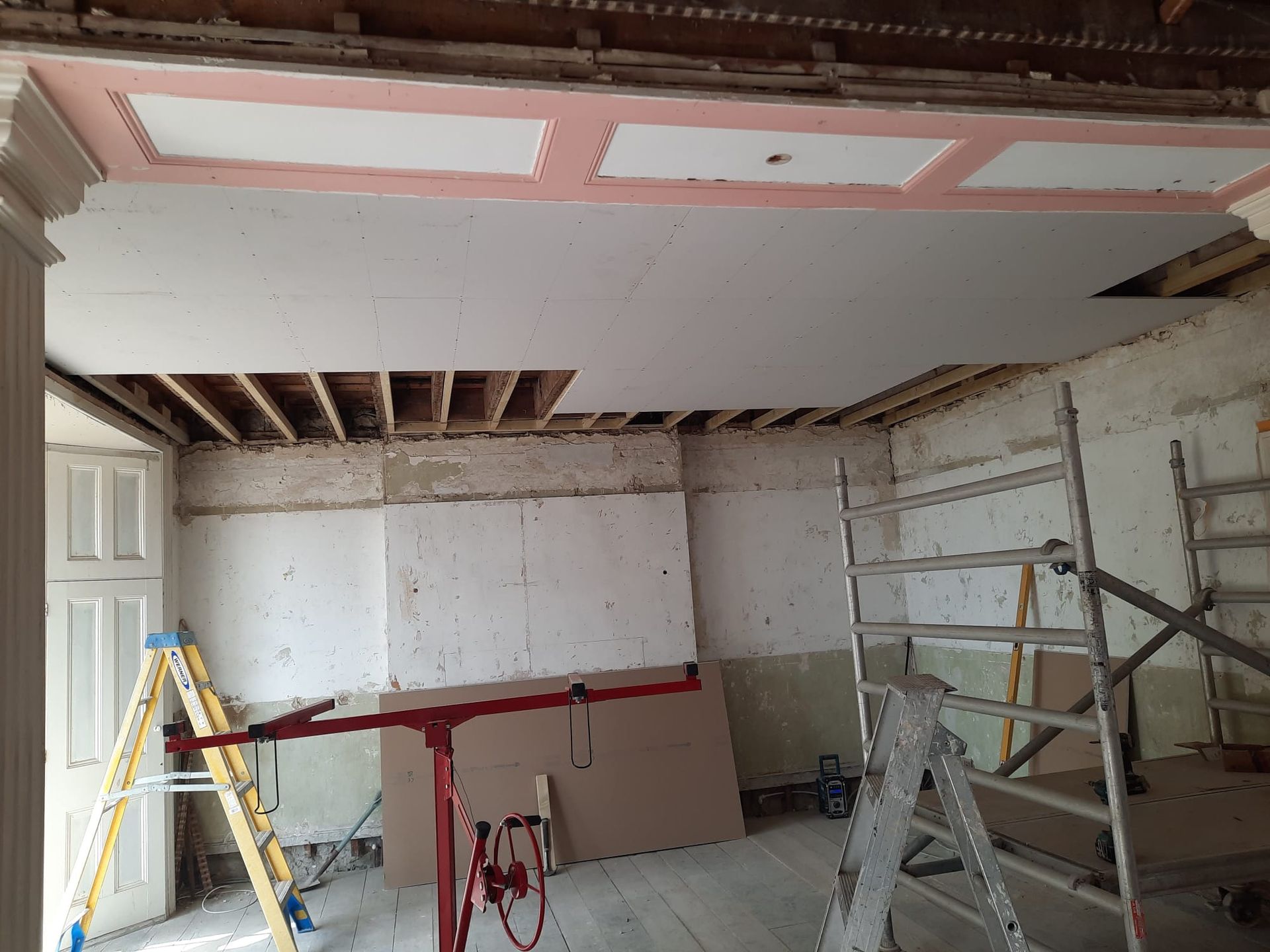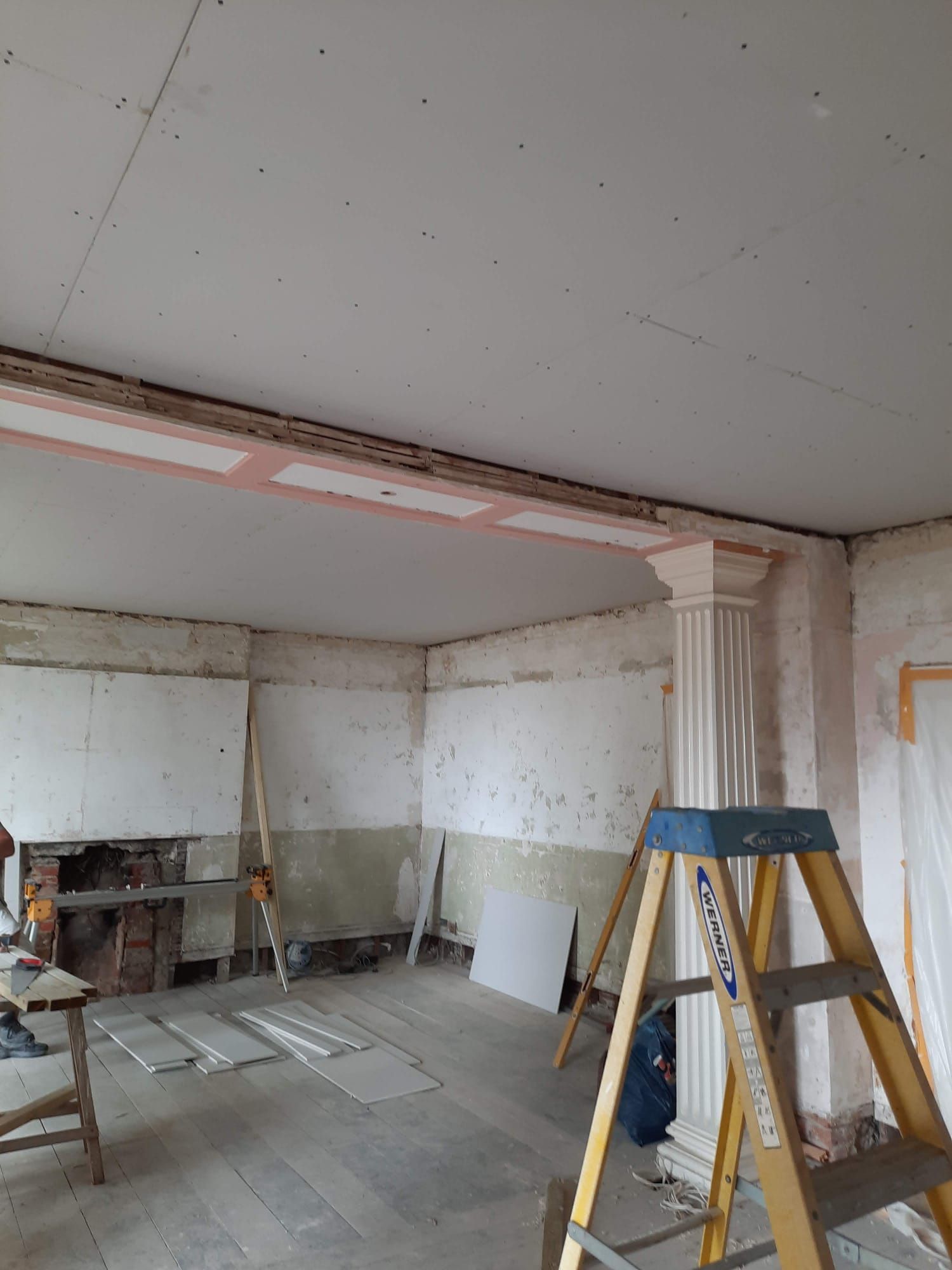 A critical component of the restoration was the plastering work performed by JMc Home Improvements IOW. Their expertise was evident as they meticulously applied a smooth, durable plaster finish to the new ceilings and walls. This step was essential in preparing the surfaces for painting and ensuring the longevity and aesthetic appeal of the room. The skill and attention to detail demonstrated by JMc Home Improvements IOW were instrumental in achieving the seamless, polished look of the finished drawing room.
