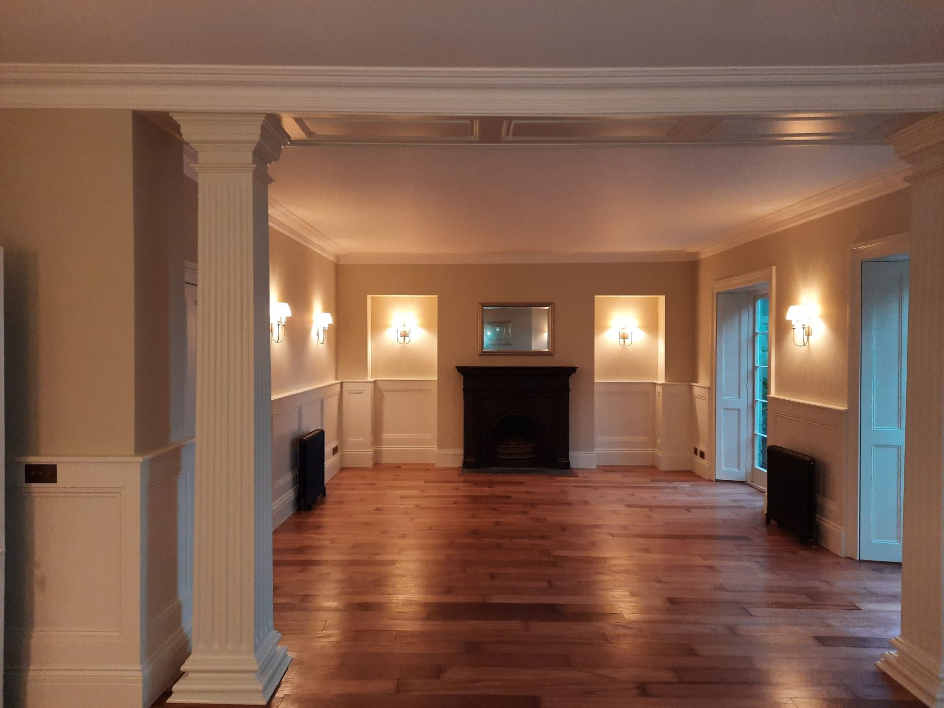 Adding to the room's charm and historical integrity, Patrick Kelly of PJ Carpentry and Joinery installed a beautiful reclaimed oak wooden floor. This choice of flooring not only enhanced the room's elegance but also provided a sustainable option, repurposing wood with a rich history of its own. Patrick's expertise ensured that each plank was expertly laid, creating a stunning, cohesive floor that perfectly complemented the room's classic design.