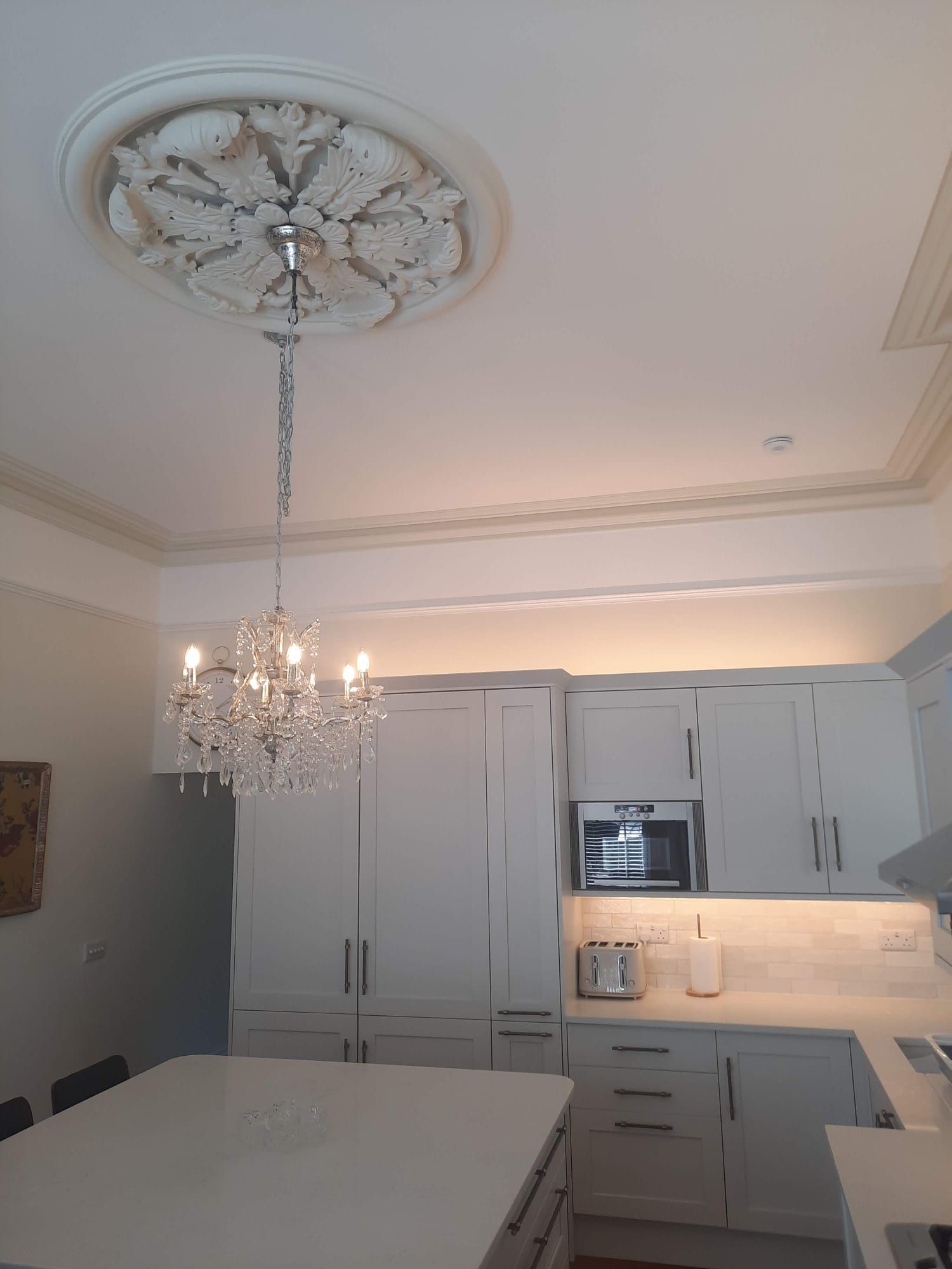 One of our key tasks was installing a lighting scheme that enhanced the apartment’s architectural beauty. The team installed under-cabinet and above-cabinet lighting in the kitchen. This approach not only provided optimum lighting for food preparation and other kitchen tasks, but also cast a warm glow on the ornate plaster cornices, accentuating their intricate details.
