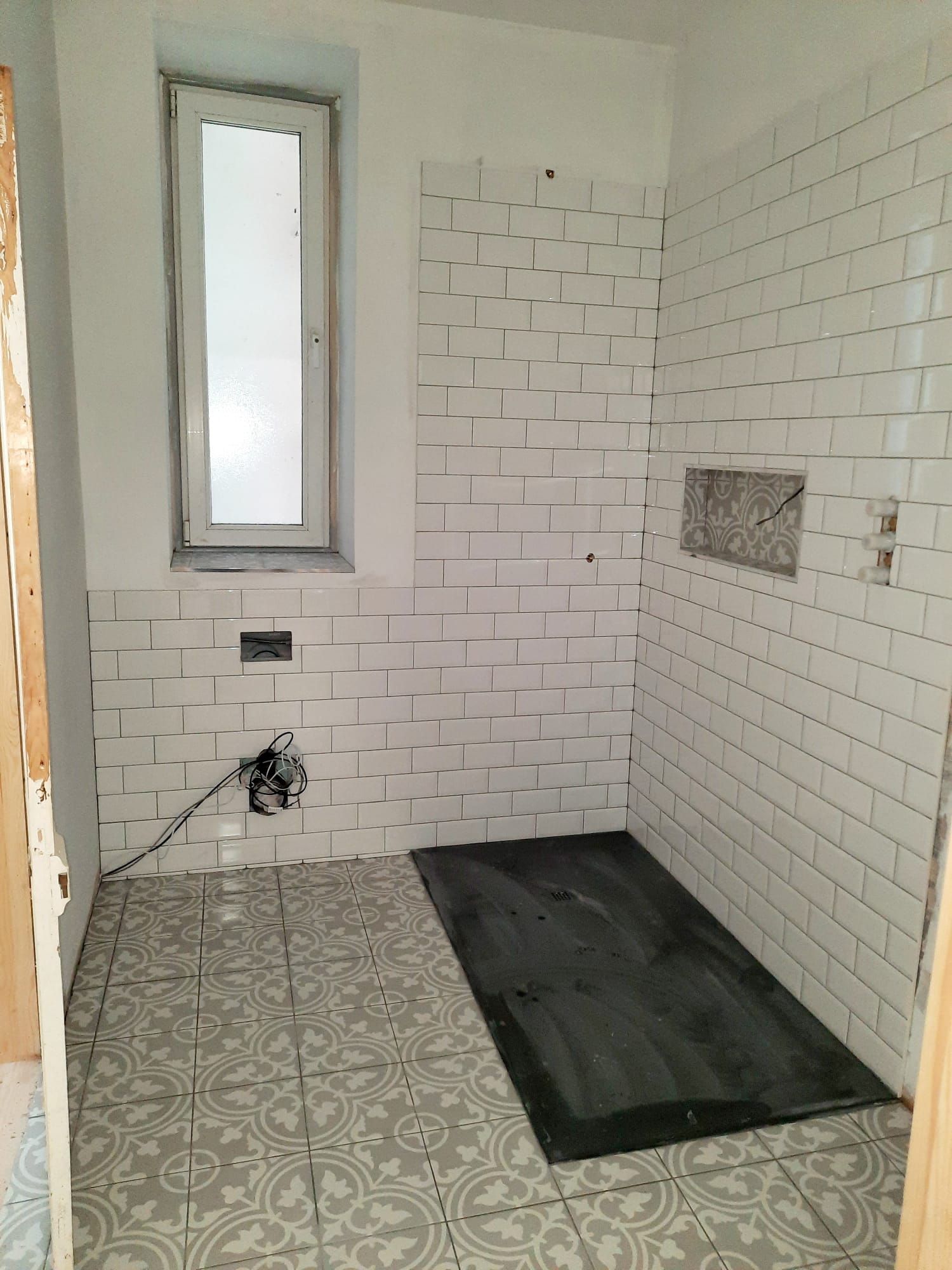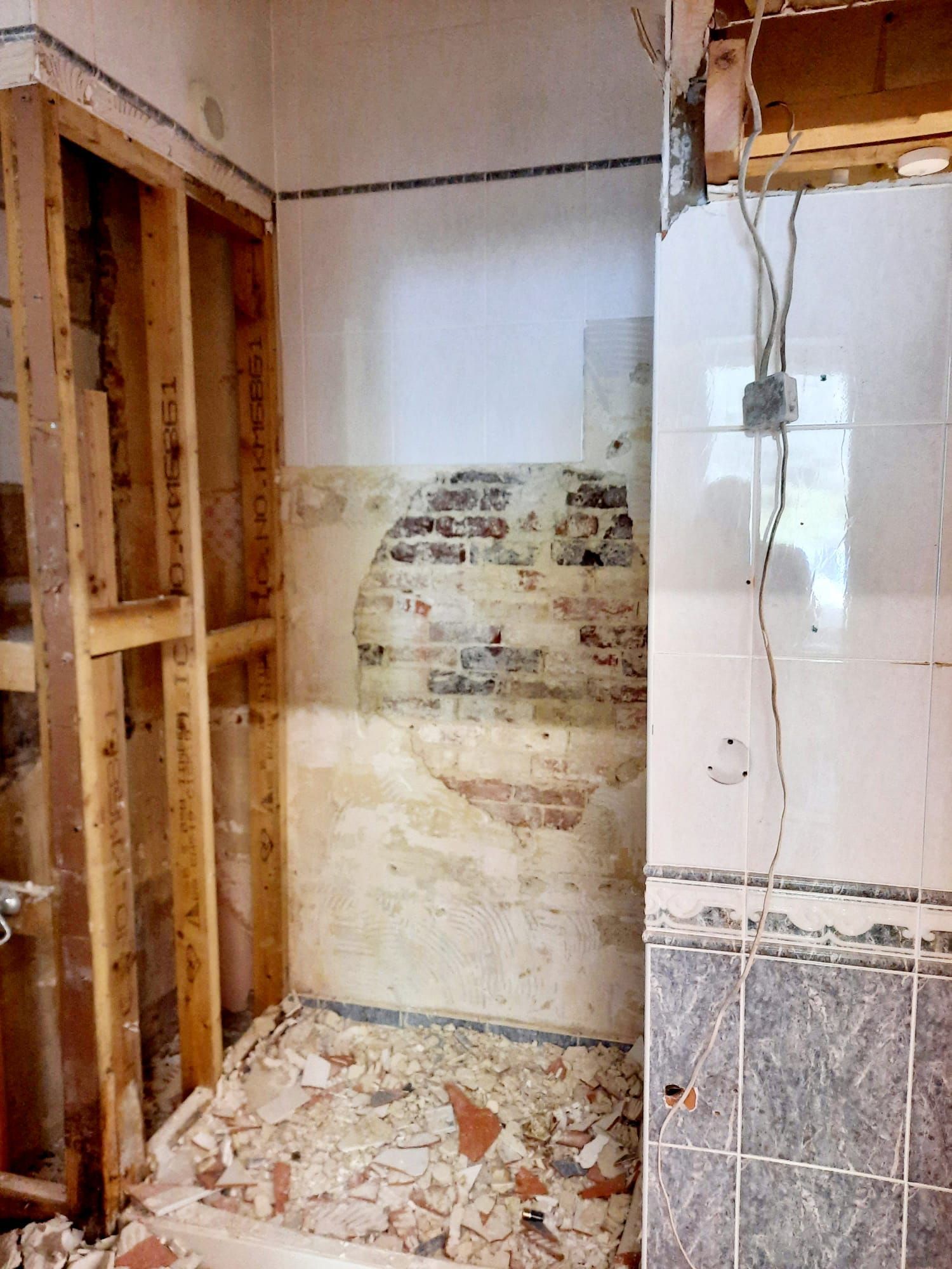 The existing shower room bore the hallmarks of a bygone era, with its 1980s style suite and tiles clashing with the Victorian character of the property. The first step was to remove these outdated elements and strip back the damp and mouldy wall and ceiling plasterboard, along with the compromised stud work, down to the brickwork and joists. This thorough removal was crucial to address decades of water damage and to prepare the space for a robust refurbishment.