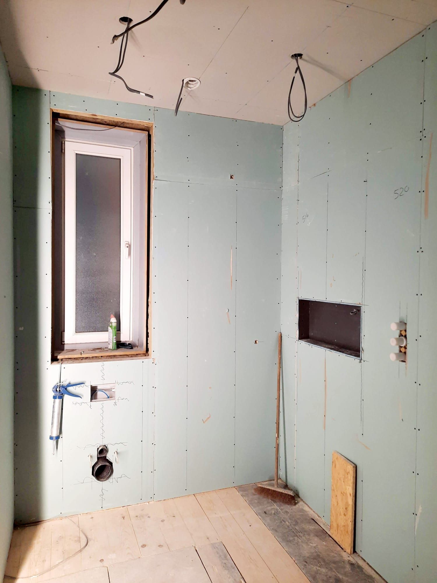 Once the room was stripped back, we treated the walls to prevent future damp issues. The existing flooring and joists, which had suffered extensive water damage, were replaced with new, sturdy joists and flooring. This foundational work ensured a solid and secure base for the new shower room. We then installed new stud walls and moisture-proof plasterboard, creating a resilient framework to support the room's new features.